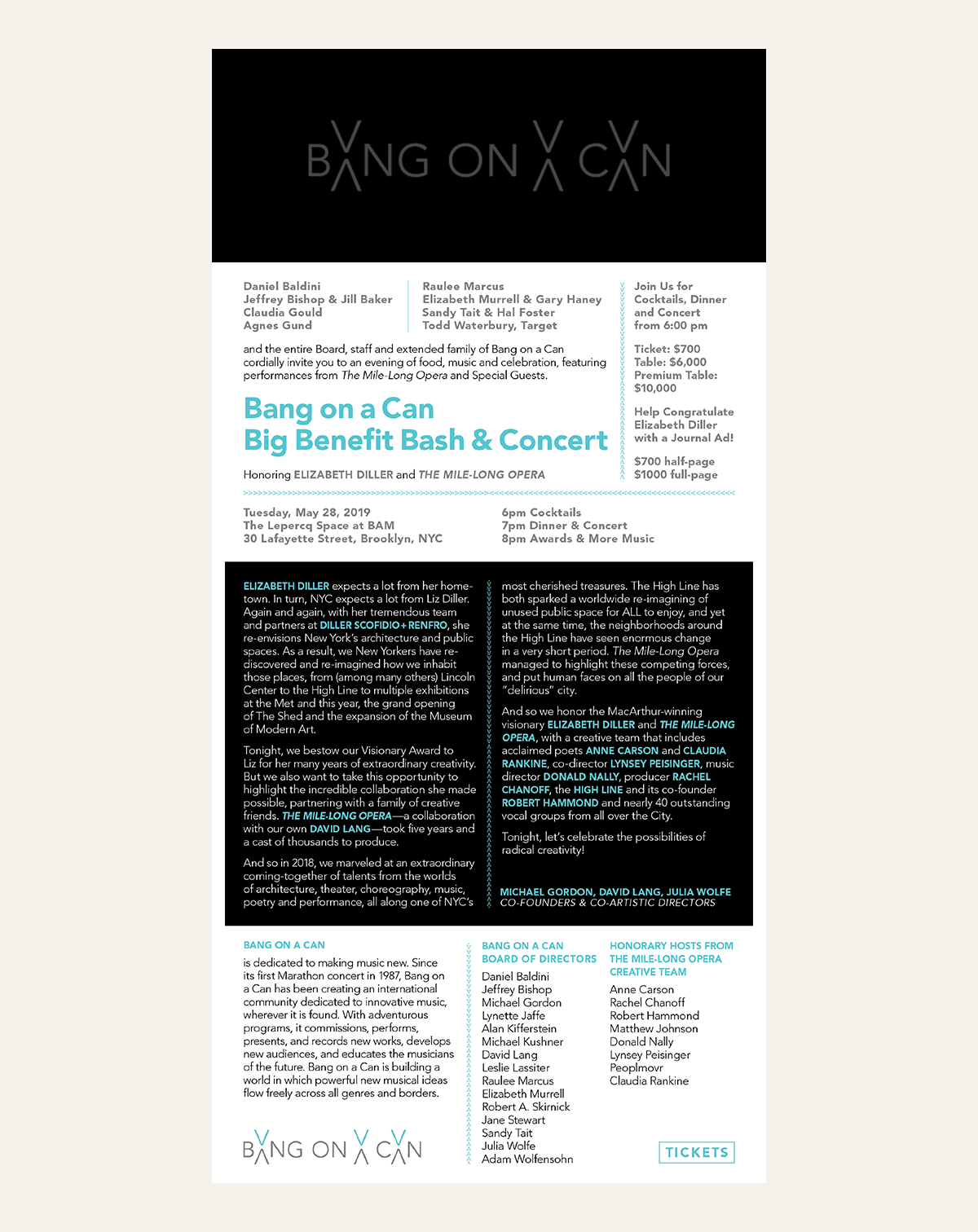 For music nonprofit Bang on a Can’s 2019 fundraiser, I created an animated email banner and print invitation based on a performance of The Mile-Long Opera by artist Elizabeth Diller. Set in one of Manhattan's most dynamic public spaces, the project brought together 1,000 singers from across New York to perform. Audiences moved in and out of groups of singers as they walked along the High Line.