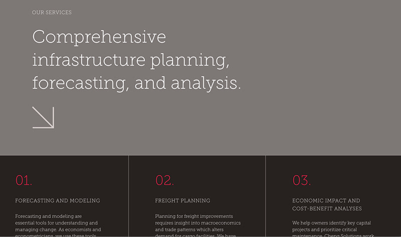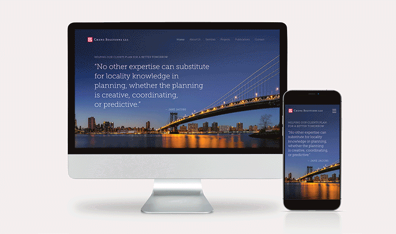 After launching its identity and website over ten years ago, Cheng Solutions grew considerably and was overdue for a website refresh. It was an opportunity to evolve their look and feel from a primarily typography-based design to a photography-based design that is evocative and showcases their varied projects.