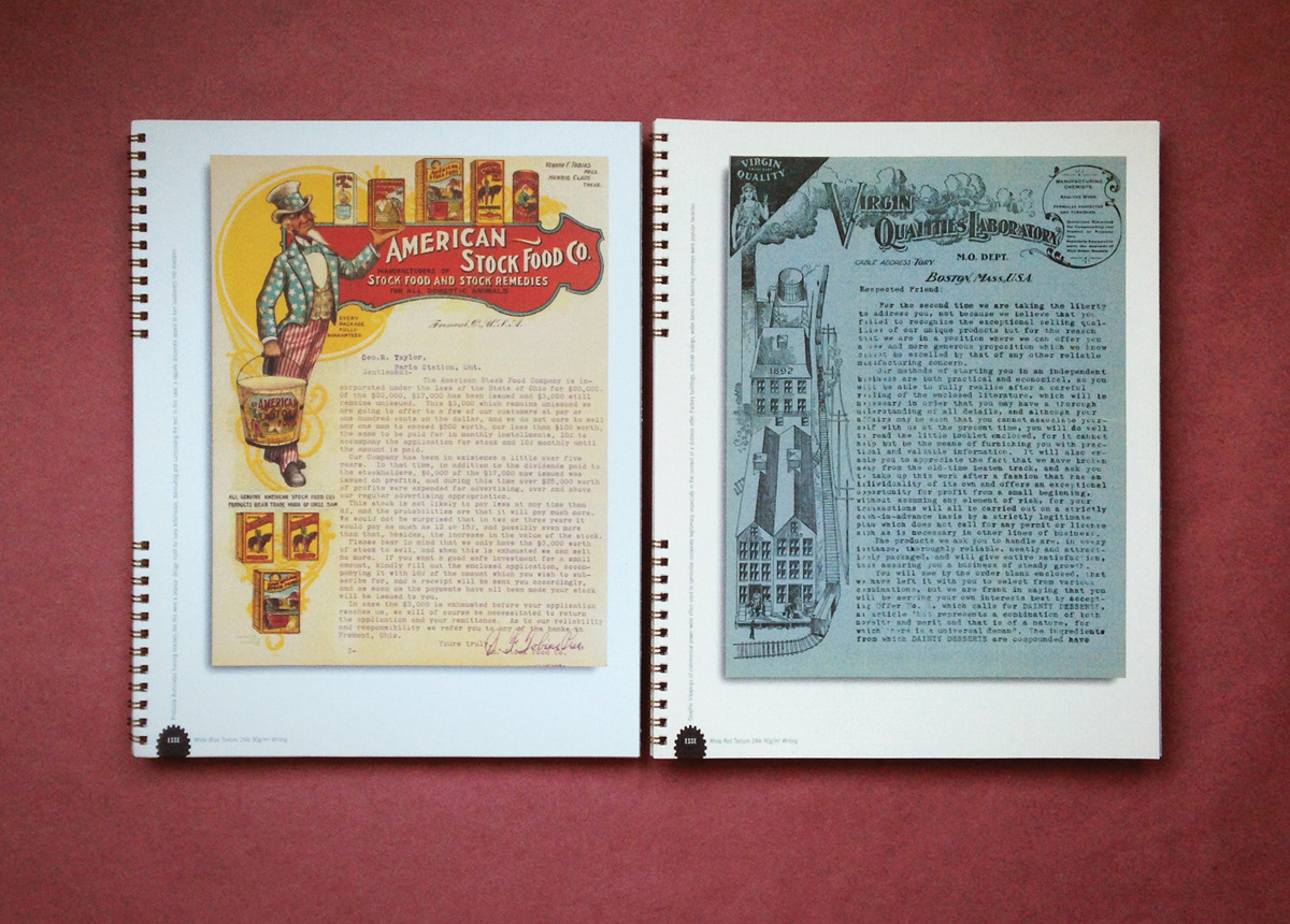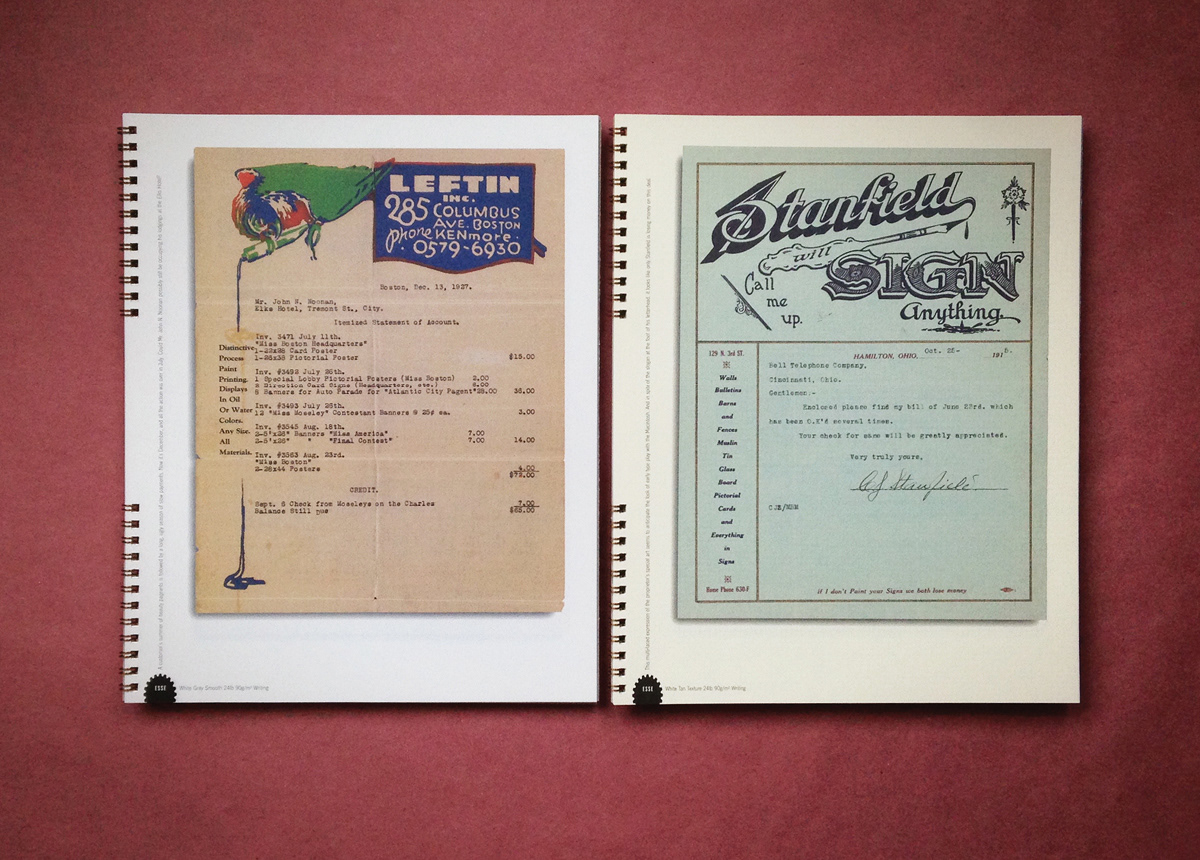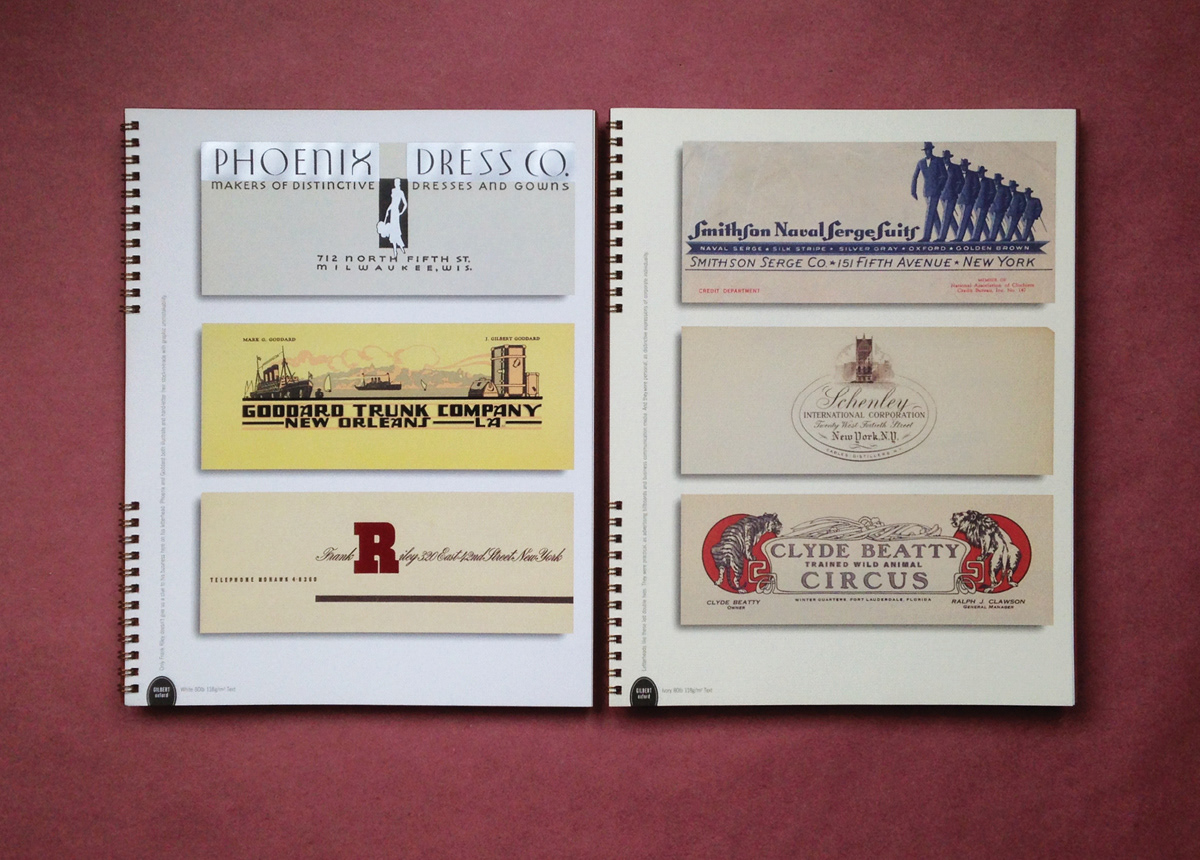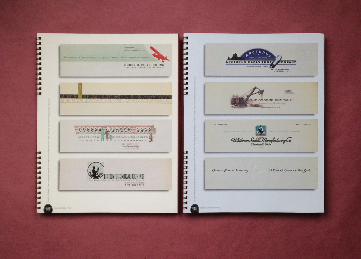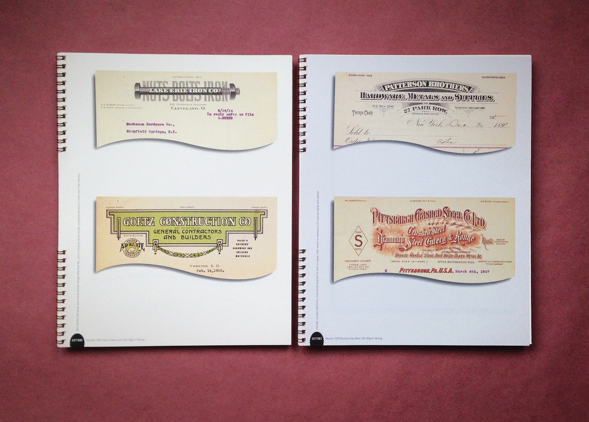 Next up is a series of three booklets showcasing three lines of paper stocks for stationery printing. Each booklet is double wiro bound in copper with French-fold covers and offset in the 4C process. The series presents a selection of letterheads culled from the late 19th and early 20th century that offers a glimpse into a forgotten time when commercial correspondence was earnestly drafted and writing surfaces were elaborately decorated.