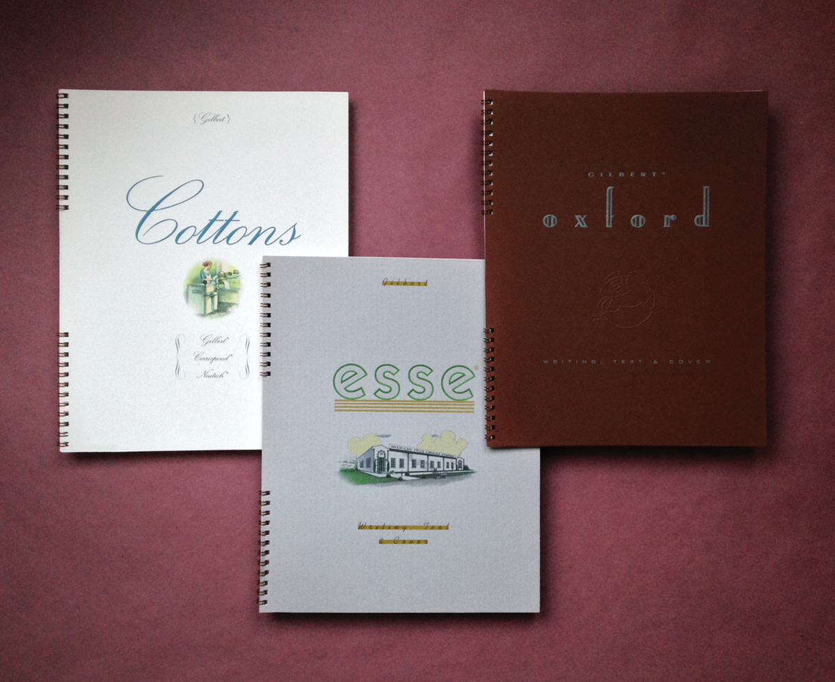 COTTONS, ESSE AND OXFORD, A series of three booklets showcasing three lines of paper stocks for stationery printing. Each booklet is double wiro bound in copper with French-fold covers and offset 4C process. The series presents a collection of letterheads from the late 19th and early 20th century that offers a glimpse into a past where commercial correspondence was earnestly drafted and writing surfaces were elaborately decorated.