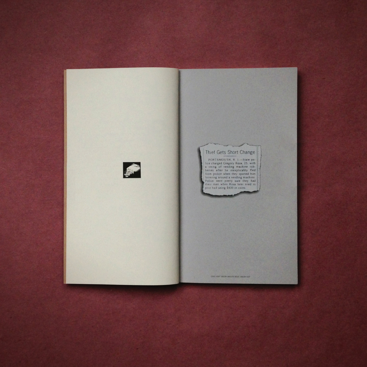 First up is "Strange But True," a collection of stories clipped from newspapers, presented on various paper stocks to illustrate their printing benefits, sent to printers and designers. Offset printed in 2 colors and perfect bound with metal rivets.