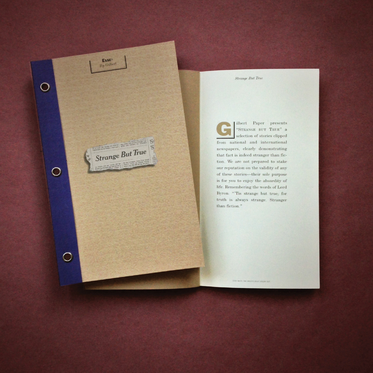 "Strange But True," a collection of stories clipped from newspapers, presented on various paper stocks to illustrate their printing benefits, sent to printers and designers. Offset printed in 2 colors and perfect bound with metal rivets.